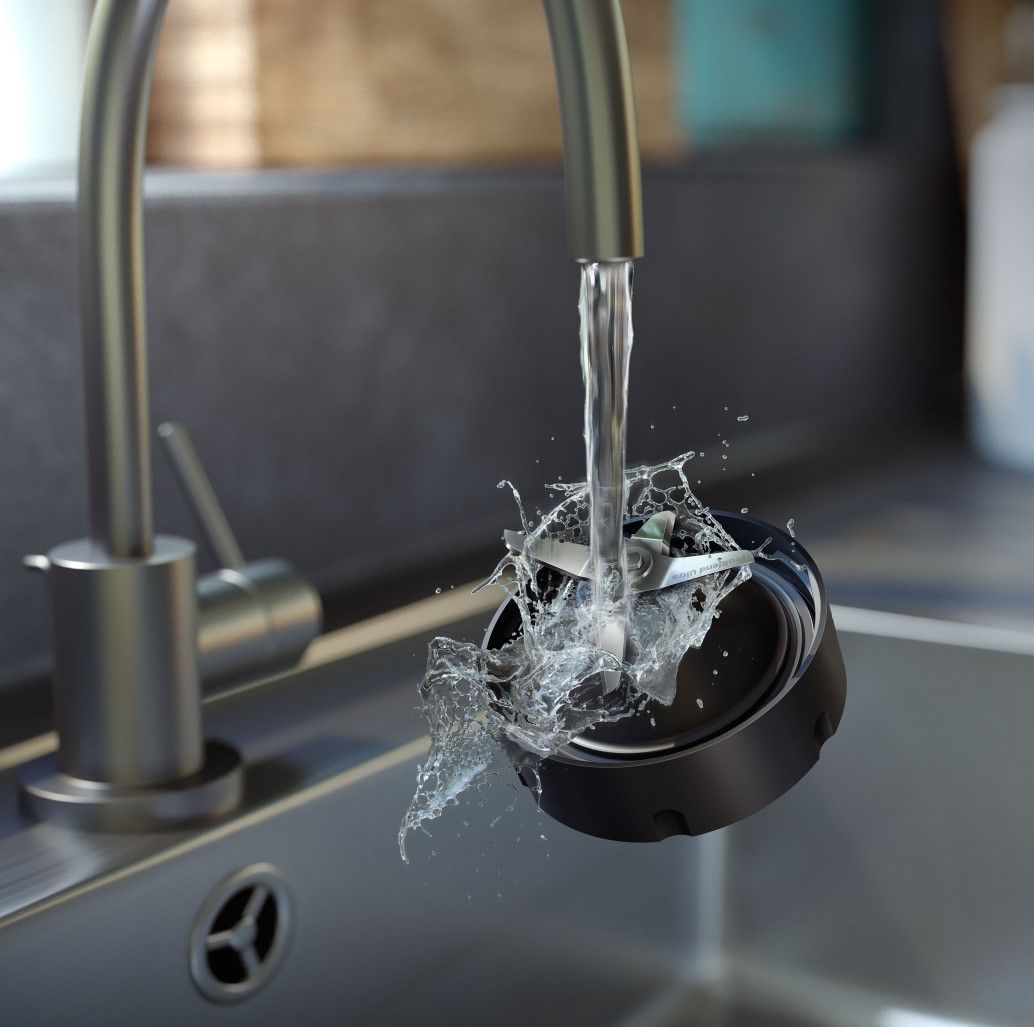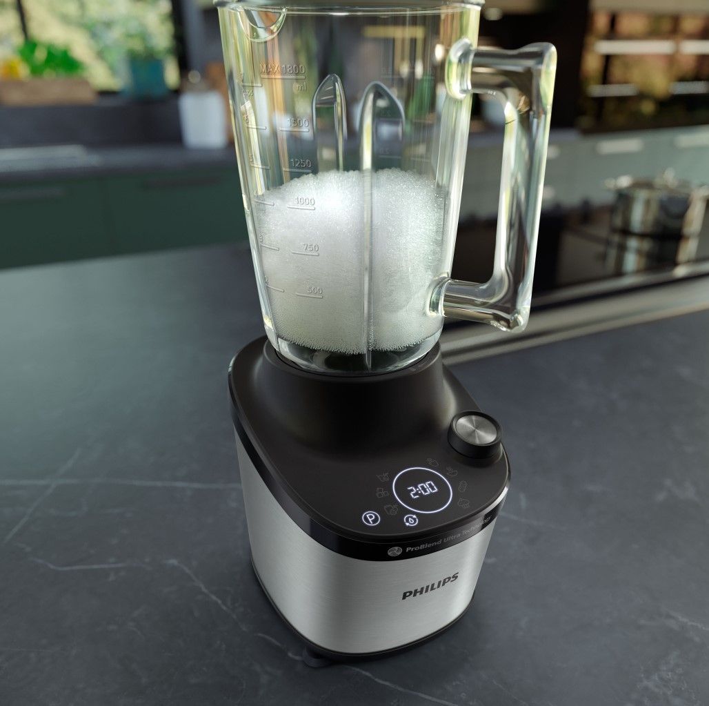 Wystarczy wlać niewielką ilość wody i płynu do mycia naczyń i uruchomić funkcję czyszczenia — w ciągu zaledwie dwóch minut urządzenie umyje się samo, usuwają nawet tak trudne zabrudzenia, jak pozostałości ciasta czy masła orzechowego.