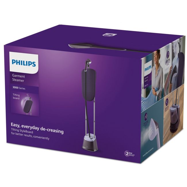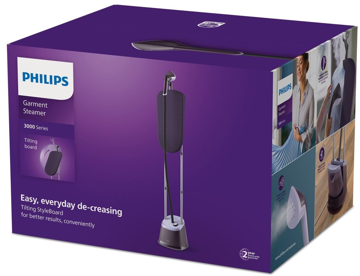 Prasuj szybciej dzięki steamerowi stojącemu serii 3000 firmy Philips, aby mieć więcej czasu na radość ze swoich ubrań. Zintegrowana i solidna deska StyleBoard oraz duża, ostro zakończona głowica steamera pozwalają z łatwością usuwać każde zagniecenia.