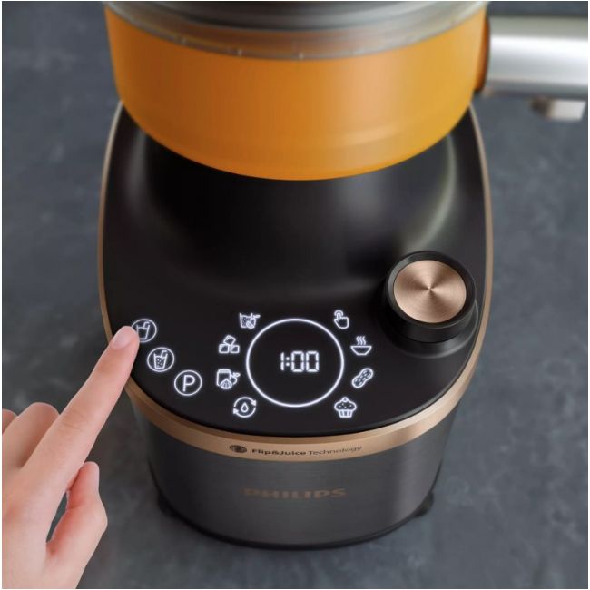Programy z określonym czasem i prędkością przyrządzania Twoich ulubionych dań można szybko wybrać na cyfrowym wyświetlaczu. Należą do nich: sok klarowny, sok z miąższem, smoothie, masło orzechowe, deser, zupa i sos. Istnieje również możliwość skorzystania z funkcji kruszenia lodu oraz czyszczenia.