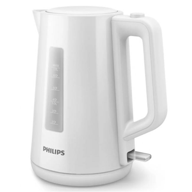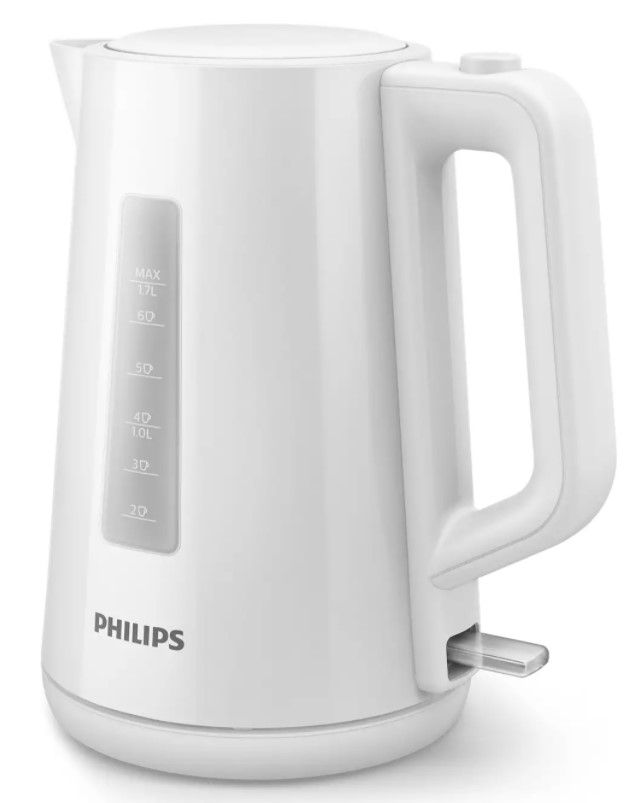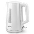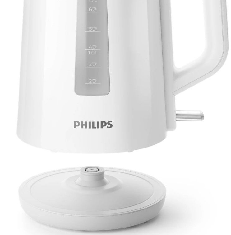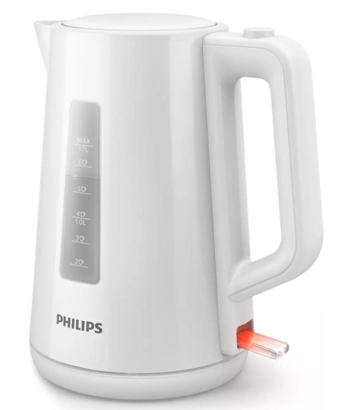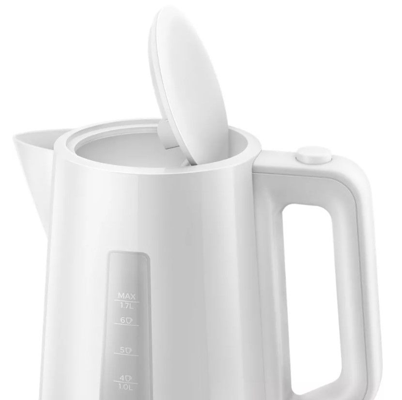 Nowy plastikowy czajnik firmy Philips o pojemności 1,7 l z automatycznie otwieraną pokrywką i wskaźnikiem umożliwia łatwe i szybkie przygotowanie ulubionego gorącego napoju.