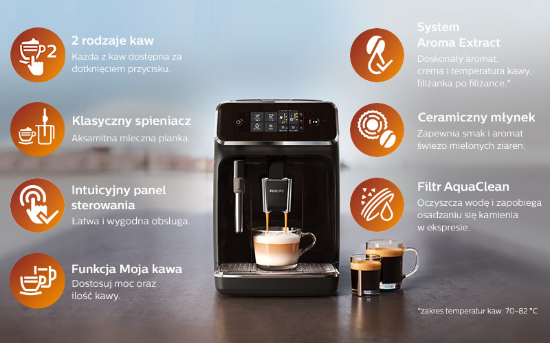Ciesz się wspaniałym smakiem i aromatem kawy ze świeżo zmielonych ziaren w idealnej temperaturze dzięki inteligentnemu systemowi parzenia. Klasyczny spieniacz do mleka pozwala z łatwością przygotować jedwabiście gładkie cappuccino lub latte macchiato.