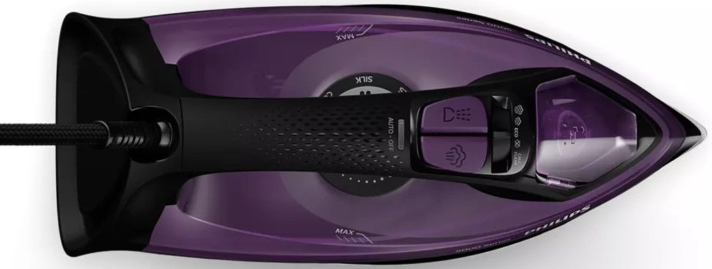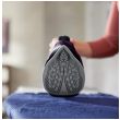 Ergonomiczny uchwyt o specjalnej fakturze zapewnia wygodę i ułatwia trzymanie żelazka bez ryzyka, że się wyślizgnie.
