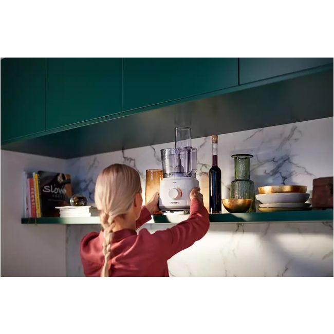 Kompaktowy robot kuchenny Daily zajmuje mniej miejsca w kuchni, a jednocześnie jest wyposażony we wszystkie niezbędne akcesoria, które można z łatwością przechowywać w jego pojemniku.
