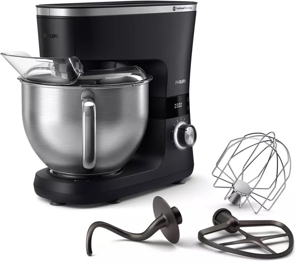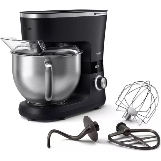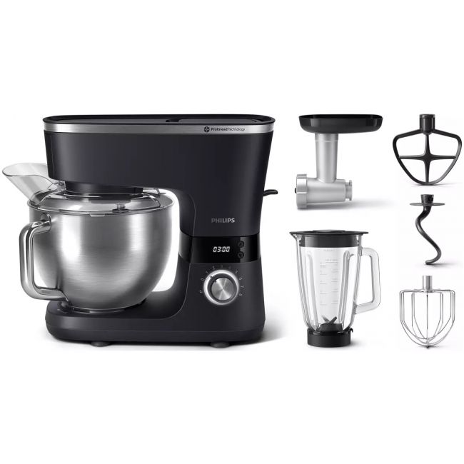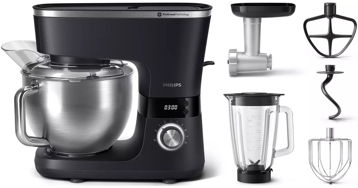 Hak do wyrabiania ciasta, ubijaczka i trzepaczka. Miska ze stali nierdzewnej 5,5 l. Mocny silnik o mocy 1000 W. Zawiera akcesoria do blendera. Zawiera akcesorium do maszynki do mielenia.