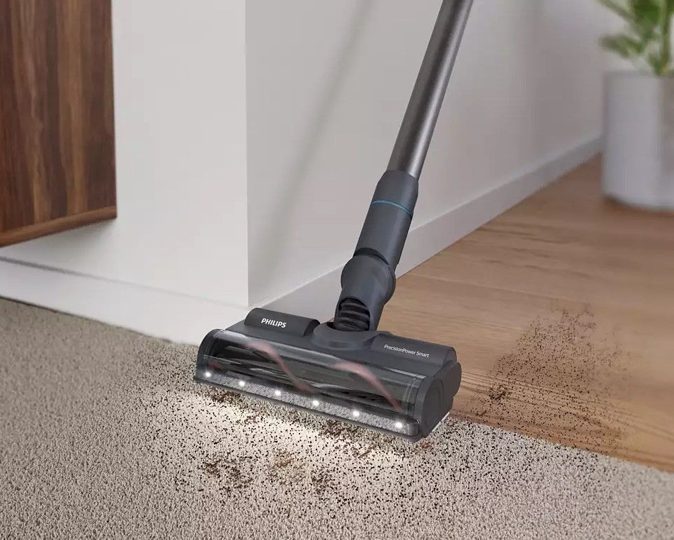 Wystarczy jeden ruch [8], aby inteligentna nasadka PrecisionPower Smart usunęła nawet 99,9% kurzu i brudu. Funkcja inteligentnego rozpoznawania twardych i miękkich podłóg automatycznie dostosowuje prędkość obrotów szczotki i siłę przepływu powietrza.
