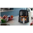 Zwarta konstrukcja jest odpowiednia dla kuchni o każdym rozmiarze. Patelnia o pojemności 4,2 l mieści do 500 g frytek, 6 udek z kurczaka lub 500 g warzyw.