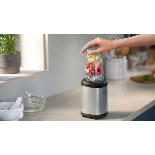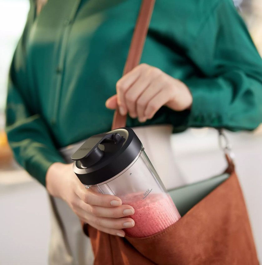Blenduj w podróży dzięki poręcznemu pojemnikowi o pojemności 700 ml. Przygotuj swój codzienny koktajl, a następnie załóż szczelną pokrywkę i zabierz go ze sobą. Możesz też przechować go w lodówce na później. Pojemnik jest wykonany z tworzywa Tritan firmy Eastman, w 100% wolny od BPA, odporny na stłuczenia i nadaje się do mycia w zmywarce.