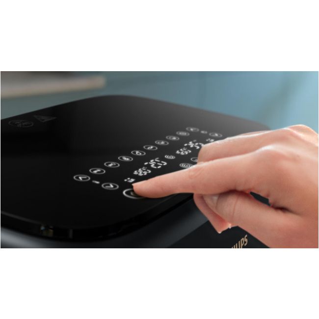 Nigdy więcej sprawdzania i zgadywania ustawień. Na ekranie dotykowym znajdziesz zaprogramowane ustawienia czasu i temperatury do świeżych frytek, mrożonych frytek, kurczaka, mięsa,warzyw, ryb, ciasta lub odgrzewania potraw.