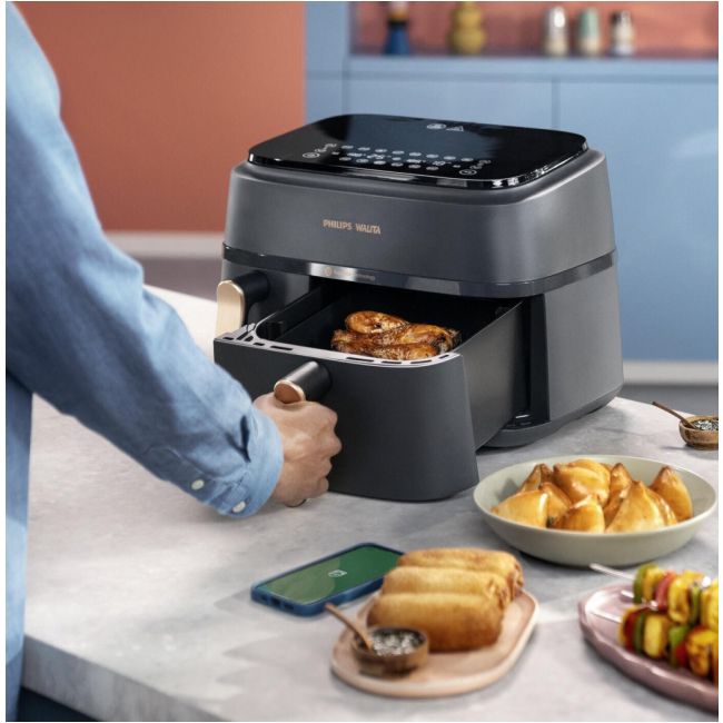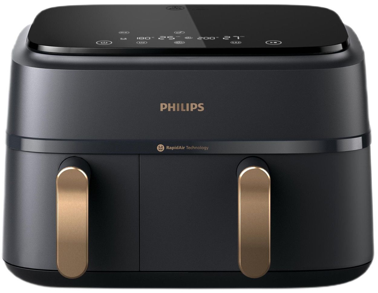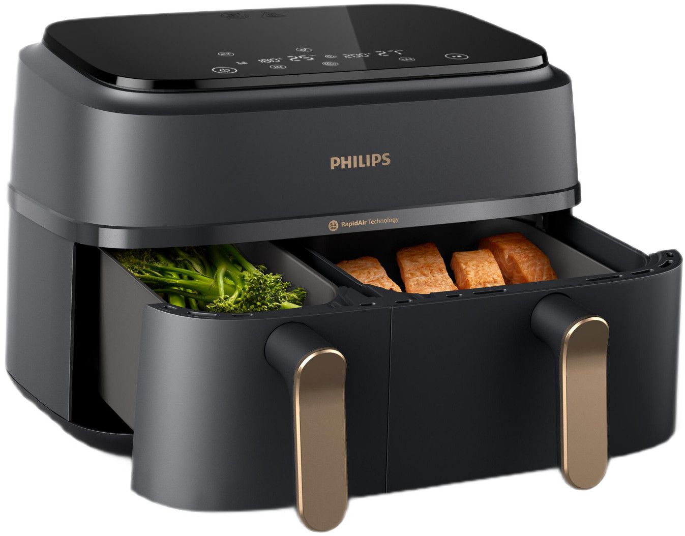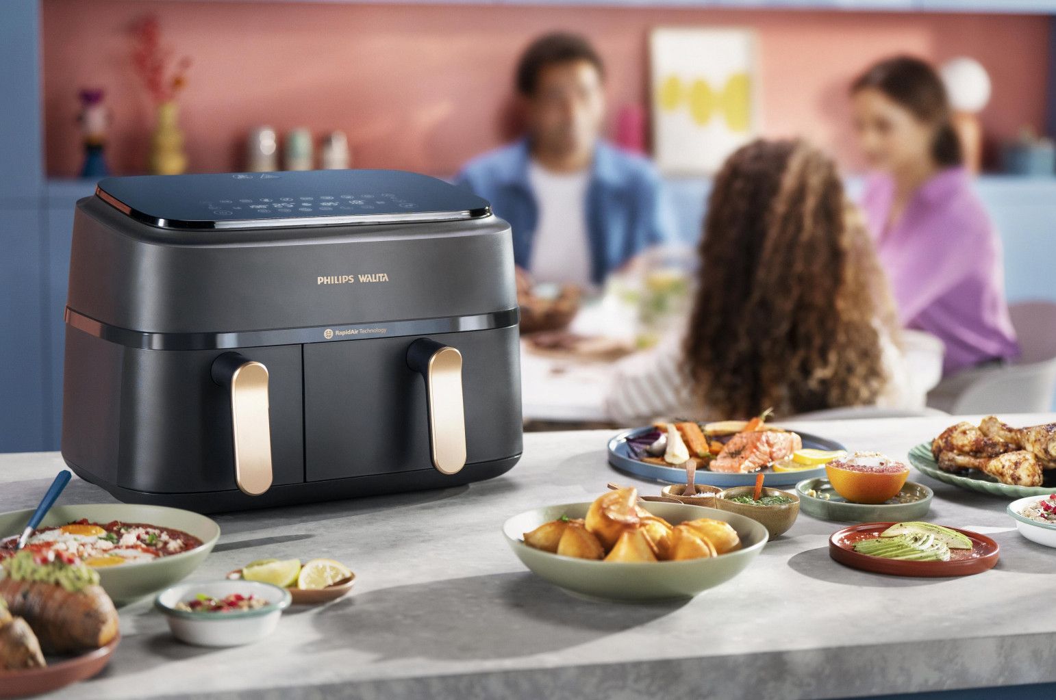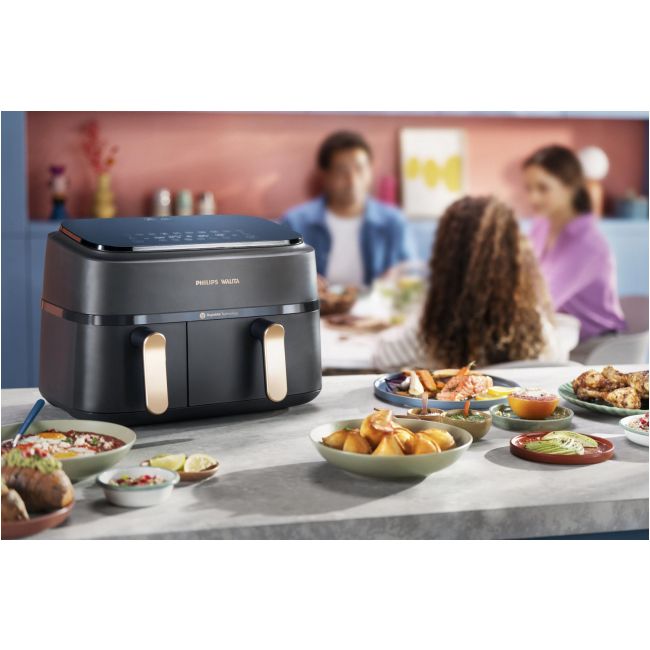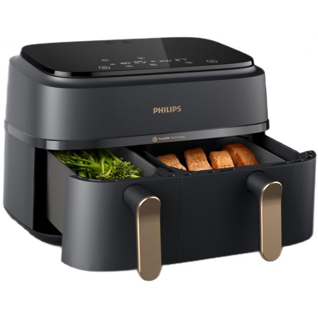 Frytownica na gorące powietrze Dual Basket Airfryer z serii 3000 firmy Philips umożliwia przygotowywanie posiłków tak, aby dwie potrawy były gorące i gotowe jednocześnie. Przyrządzaj smaczne i zdrowe posiłki dzięki dużej szufladzie, w której przygotujesz danie dla całej rodziny, oraz mniejszej, przeznaczonej na przystawki lub dania dla jednej osoby.