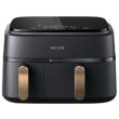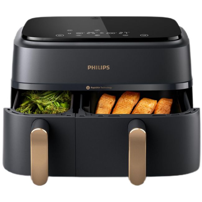 Frytownica na gorące powietrze Dual Basket Airfryer z serii 3000 firmy Philips umożliwia przygotowywanie posiłków tak, aby dwie potrawy były gorące i gotowe jednocześnie. Przyrządzaj smaczne i zdrowe posiłki dzięki dużej szufladzie, w której przygotujesz danie dla całej rodziny, oraz mniejszej, przeznaczonej na przystawki lub dania dla jednej osoby.