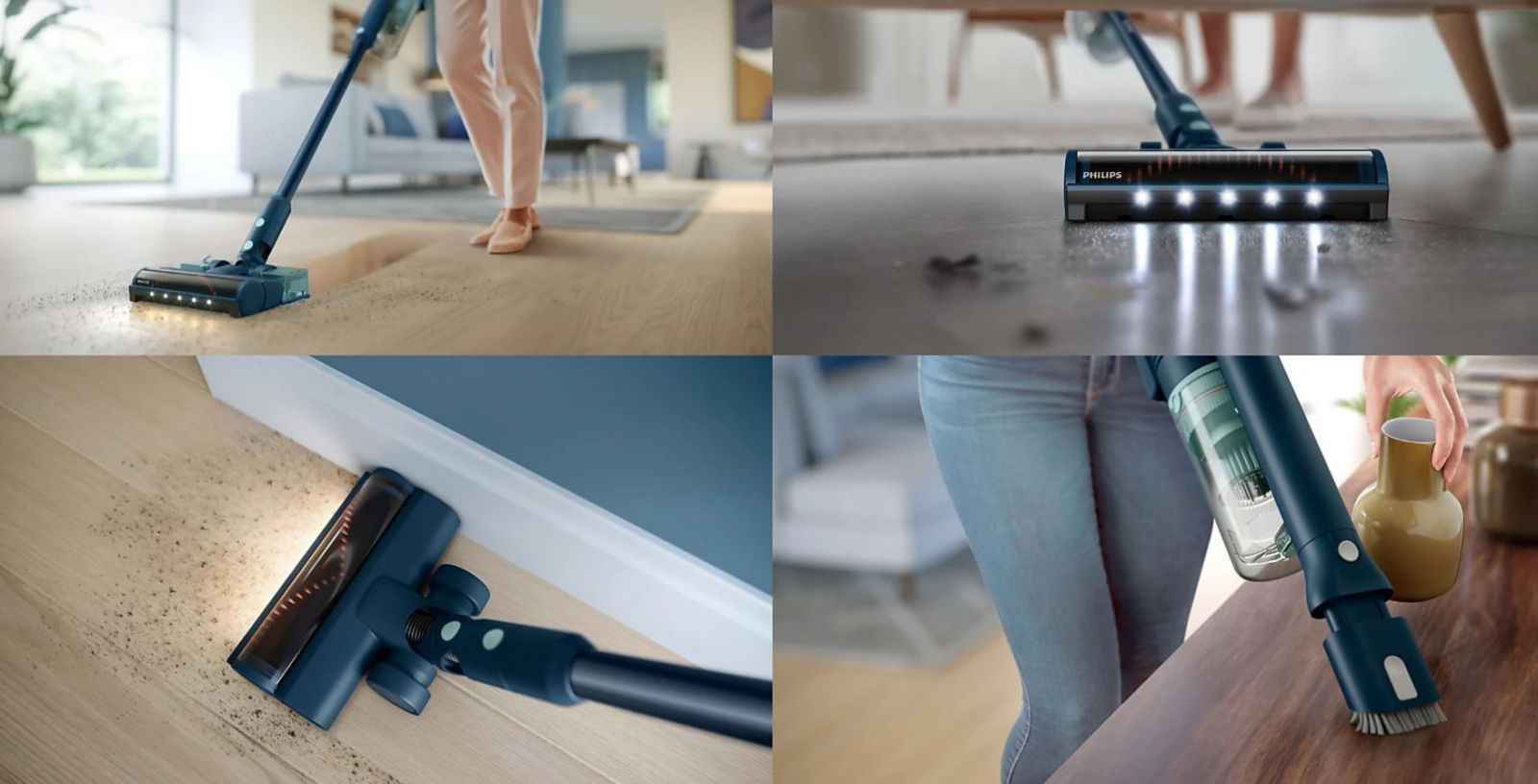 Nasadka odkurzaczy z serii Philips 5000 zapewnia idealne czyszczenie zarówno dywanów, jak i twardych podłóg, bez konieczności zmiany nasadki czy urządzenia.