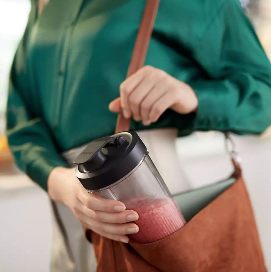 Blenduj w podróży dzięki poręcznemu pojemnikowi o pojemności 700 ml. Przygotuj swój codzienny koktajl, a następnie załóż szczelną pokrywkę i zabierz go ze sobą. Możesz też przechować go w lodówce na później. Pojemnik jest wykonany z tworzywa Tritan firmy Eastman, w 100% wolny od BPA, odporny na stłuczenia i nadaje się do mycia w zmywarce.