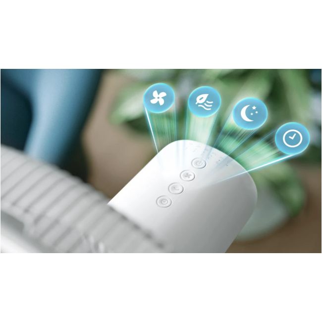 Maksymalne orzeźwienie przy minimalnym hałasie. Ten wiatrak stojący szybko wentyluje duże pomieszczenia dzięki wydajnemu, ale bardzo cichemu przepływowi powietrza. Dyskretny i elegancki design sprawia, że idealnie wpasuje się w każde wnętrze Dopasuj jego pracę do swoich potrzeb dzięki trzem prędkościom nawiewu, dwóm trybom pracy i timerowi.