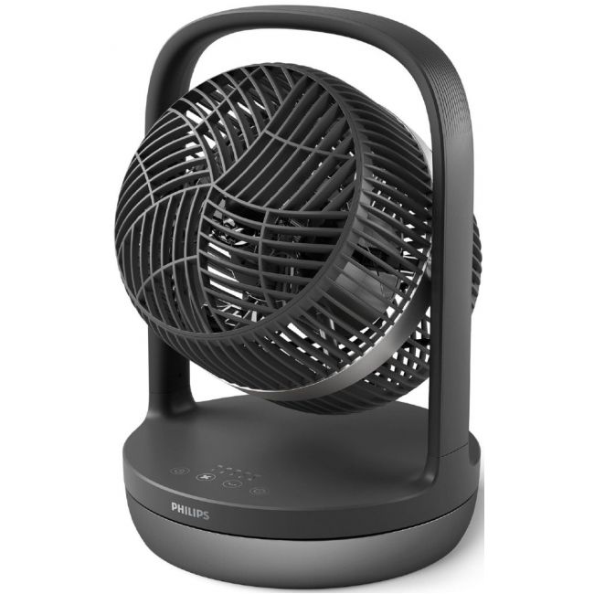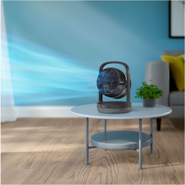 Przenośny, kompaktowy wentylator biurkowy z odchylaną głowicą zapewnia ochłodę latem i cyrkulację powietrza przez cały rok.