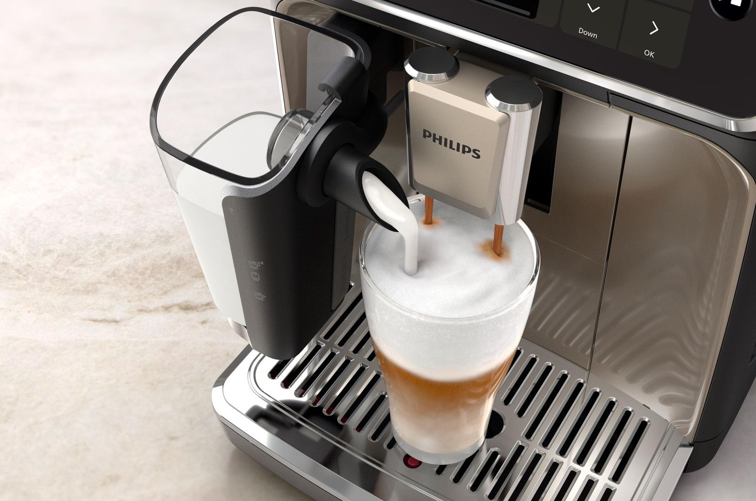 Wybierz jeden z 20 pysznych przepisów na kawę w LatteGo 5500. Od mlecznej latte po orzeźwiającą kawę mrożoną — każdy napój zaparzy się w idealnej temperaturze, z doskonałym aromatem i crema. LatteGo zapewnia jedwabiście gładką i gęstą piankę oraz łatwe czyszczenie.