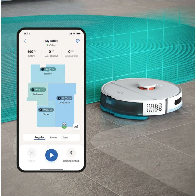 Robot odkurza i myje twarde podłogi za jednym razem, usuwając cienką warstwę kurzu, który gromadzi się na podłodze każdego dnia. Urządzenie usuwa więcej drobnego kurzu niż samo odkurzanie, dzięki czemu Twoje stopy pozostają czyste nawet wtedy, gdy chodzisz boso.
