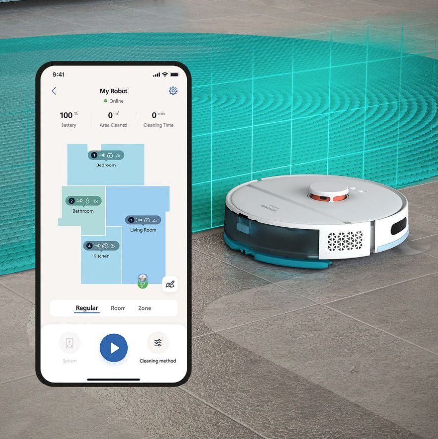 Aplikacja robota Philips HomeRun jest intuicyjna i przyjazna dla użytkownika. Zawiera instrukcje krok po kroku i pomocne filmy, które pomogą Ci w pełni wykorzystać możliwości robota. Aplikacja komunikuje się z Twoim robotem, dzięki czemu możesz kontrolować wydajność sprzątania z dowolnego miejsca, przeglądać raporty i aktualizacje dotyczące wydajności sprzątania oraz dowiedzieć się w czasie rzeczywistym, które obszary zostały już wyczyszczone. Zdecyduj, jak posprzątać pomieszczenie, gdzie robot nie może sprzątać lub o której godzinie robot powinien posprzątać Twój dom, aby podłoga lśniła czystością, gdy wrócisz do domu.