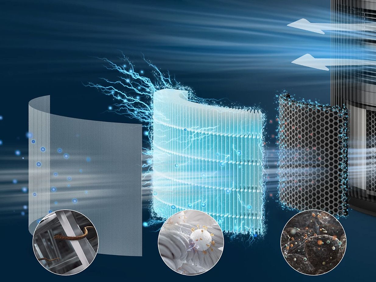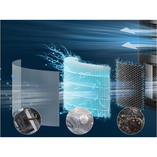 4-warstwowa filtracja z filtrem wstępnym, HEPA NanoProtect i podwójną warstwą węgla aktywnego wychwytującą 99,97% cząstek o wielkości do 0,003 mikrona (1), aby chronić Cię przed zanieczyszczeniami, wirusami, alergenami, bakteriami i nieprzyjemnymi zapachami.