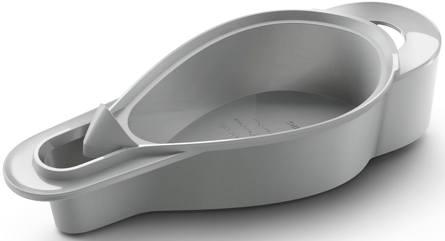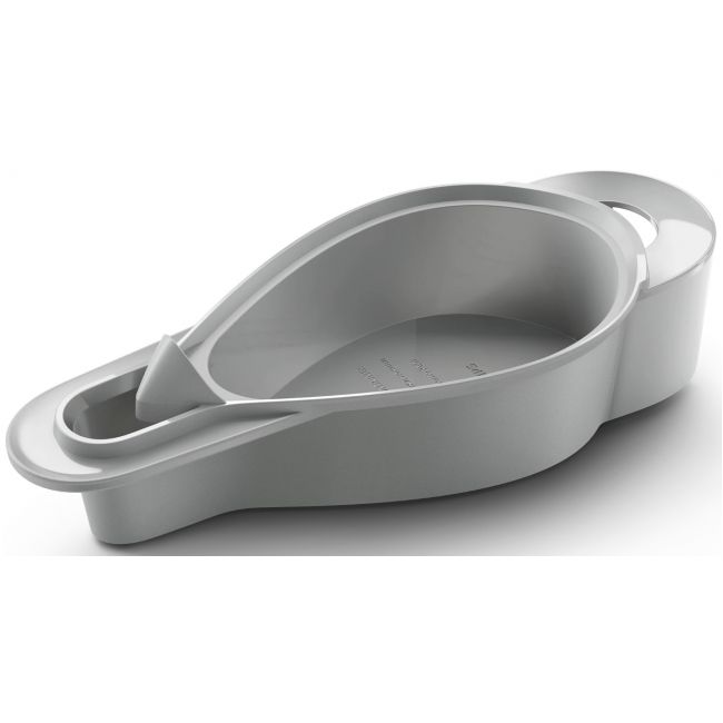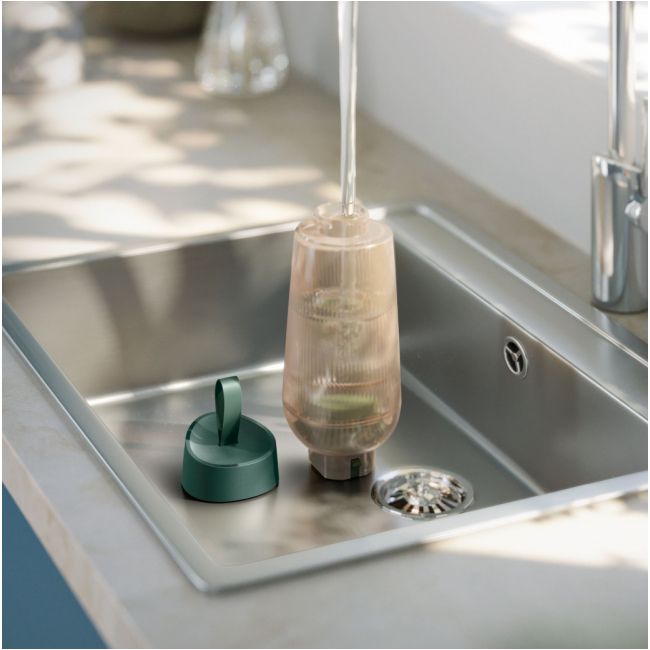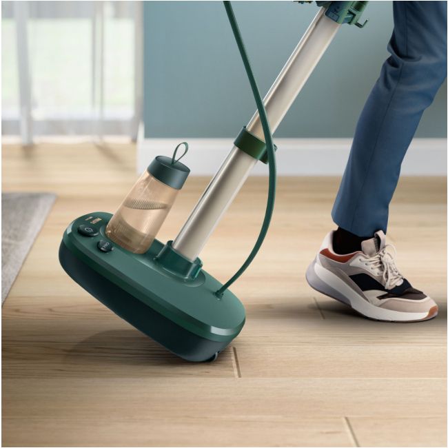 Łatwa w użyciu podstawa zawiera dwa praktyczne przyciski nożne do wygodnego włączania/wyłączania urządzenia i aktywowania trybu odkamieniania oraz odłączany zbiornik na wodę o pojemności 1,1 l w kształcie butelki.