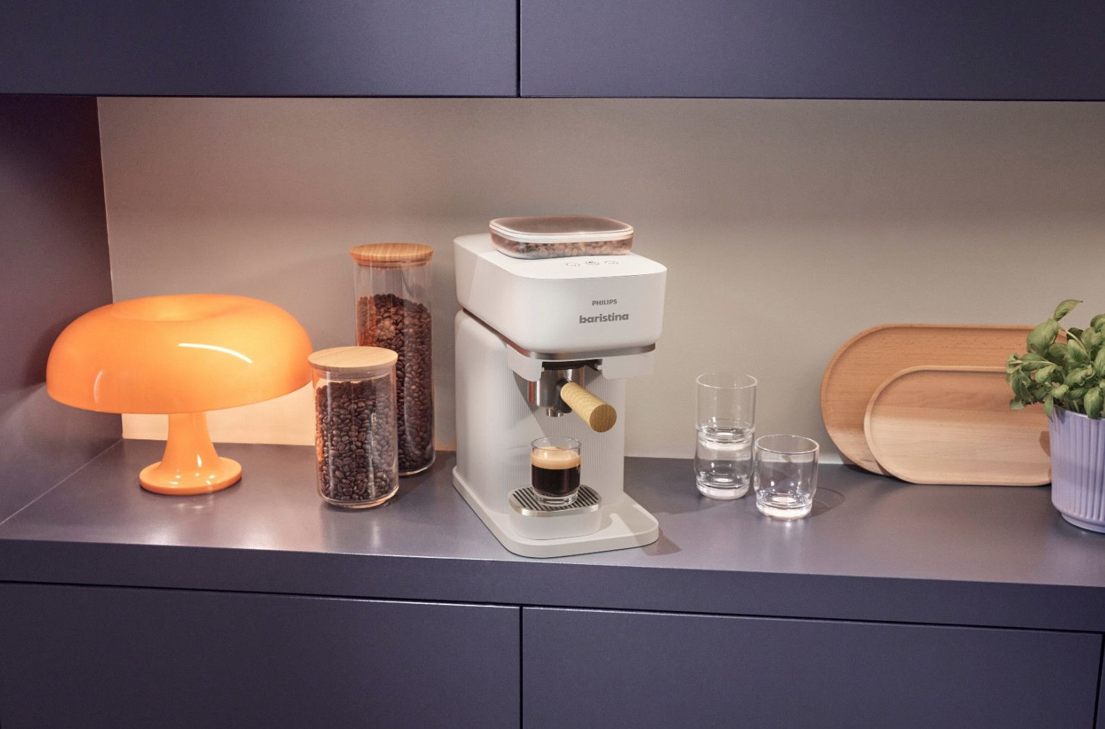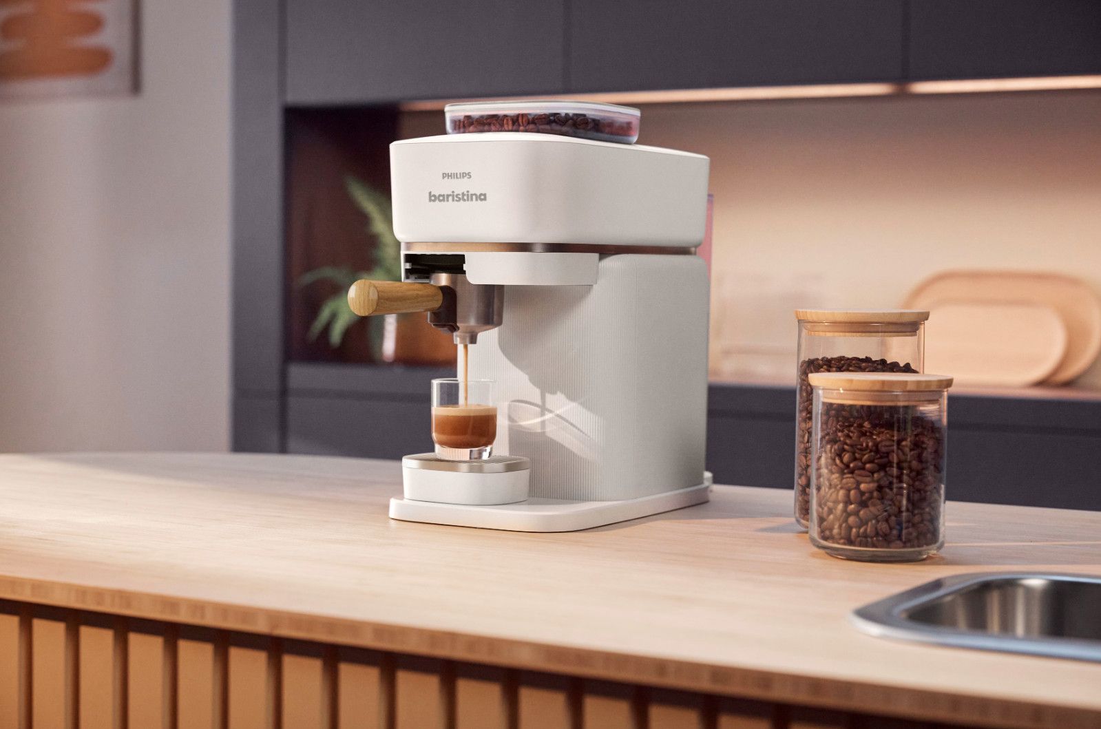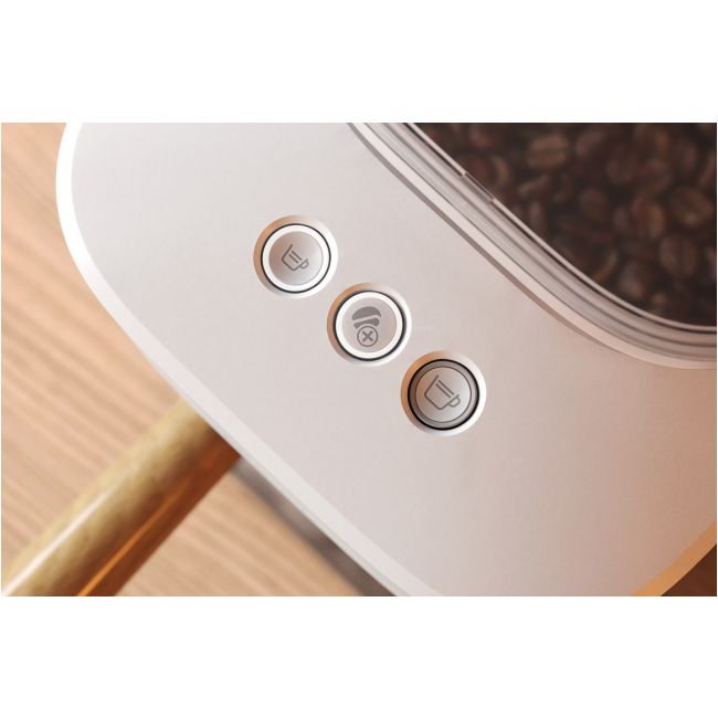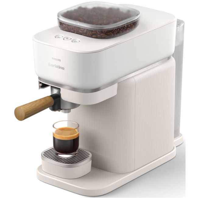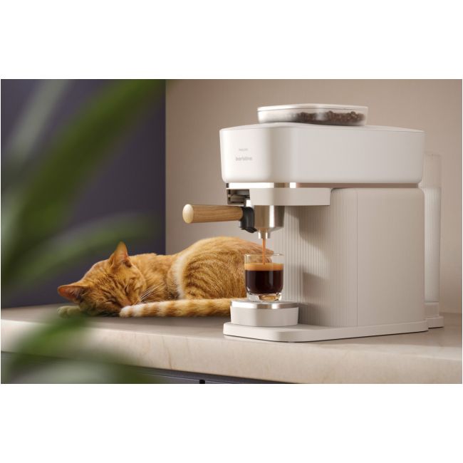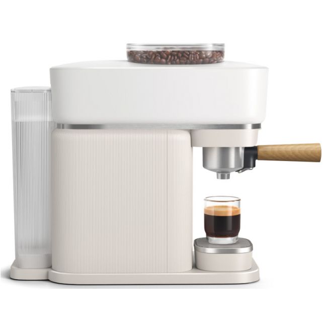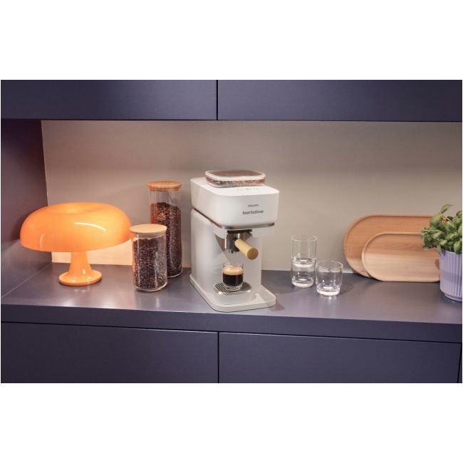 Twój osobisty barista, który zmieści się na każdym kuchennym blacie. Wsyp ziarna, przesuń uchwyt i delektuj się wyśmienitym espresso. Ekspres automatycznie mieli ziarna, uwalniając ich super świeży aromat. Perfekcyjnie ubija kawę w portafiltrze, a do tego idealnie dobiera ciśnienie. Twój nowy ulubiony barista, który czeka na każde skinienie. Przesuń uchwyt i przygotuj się na prawdziwe espresso ze świeżo zmielonych ziaren.