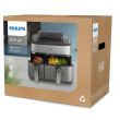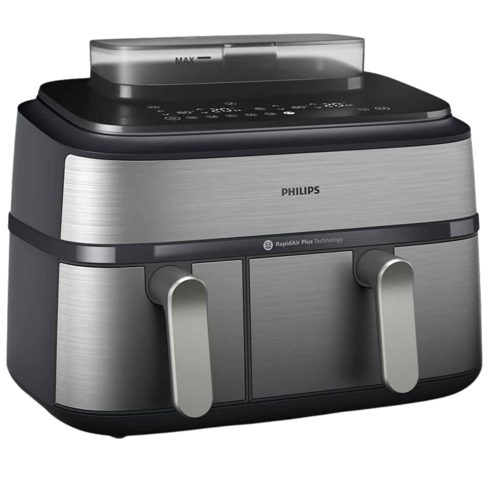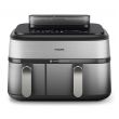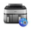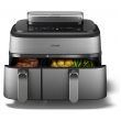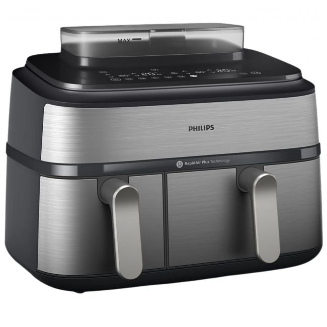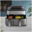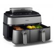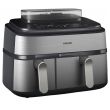 Urządzenie Airfryer o pojemności 9 litrów z 2 koszykami i funkcją gotowania na parze: szuflada o pojemności 6 l na dania główne, frytki i ulubione potrawy oraz szuflada o pojemności 3 l na dodatki i przekąski. Może pomieścić do 1100 g frytek, 1600 g warzyw lub 12 pałek kurczaka. W dużym koszyku zmieści się także cały kurczak o wadze 1,2 kg