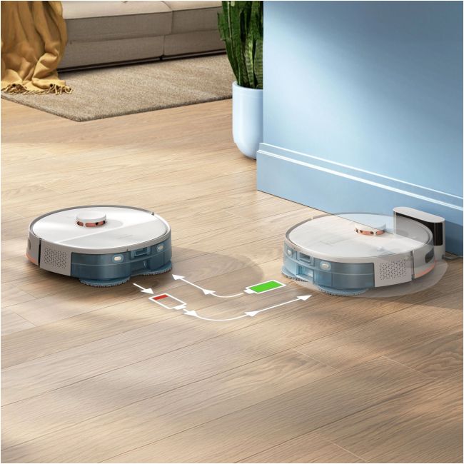 Wydajny akumulator litowo-jonowy 4800 mAh umożliwia odkurzaczowi pracę przez 200 minut³, co wystarczy na posprzątanie dużego domu. Gdy akumulator będzie na wyczerpaniu, odkurzacz powróci do stacji, by go naładować, po czym powróci do miejsca, w którym przerwał sprzątanie, aby je wznowić.