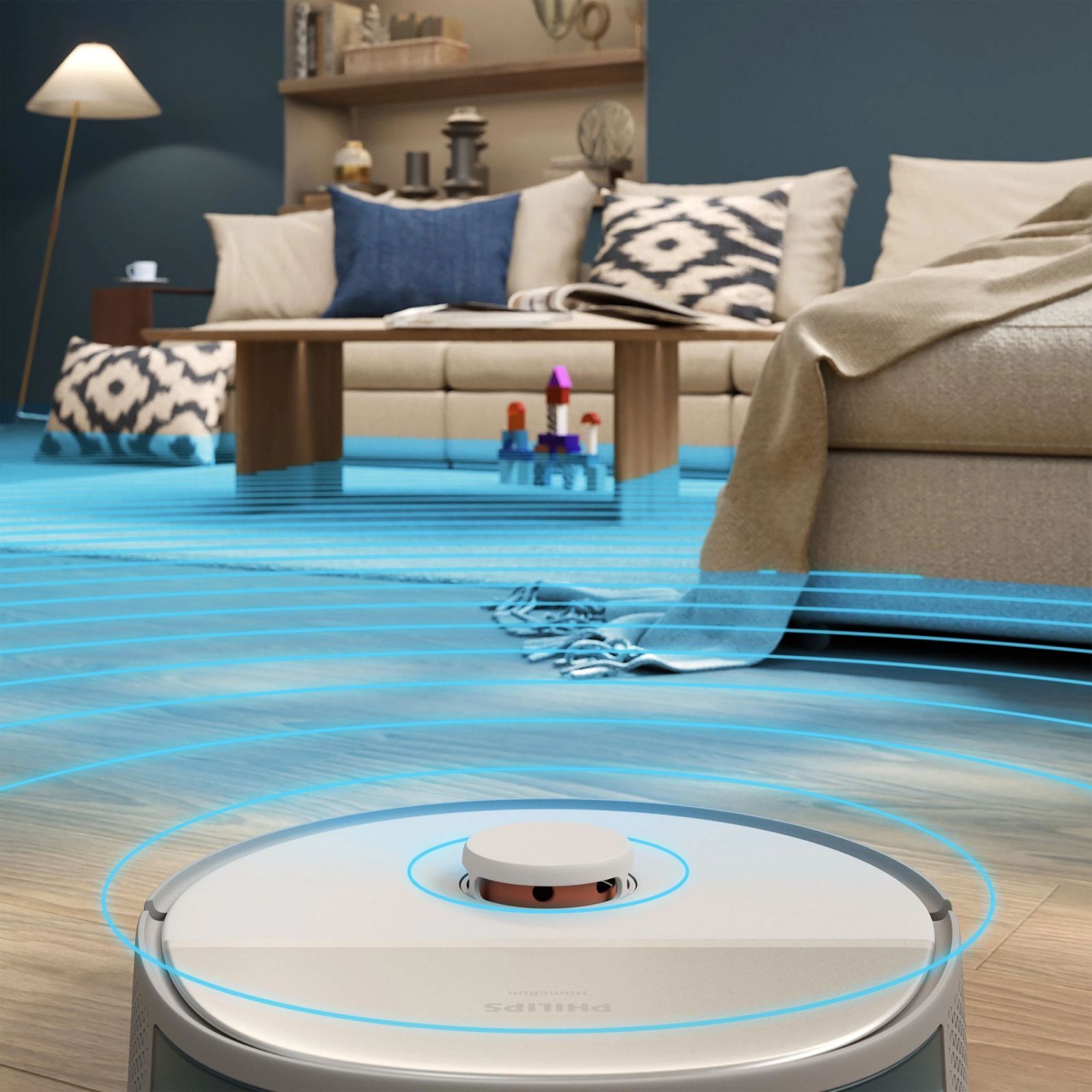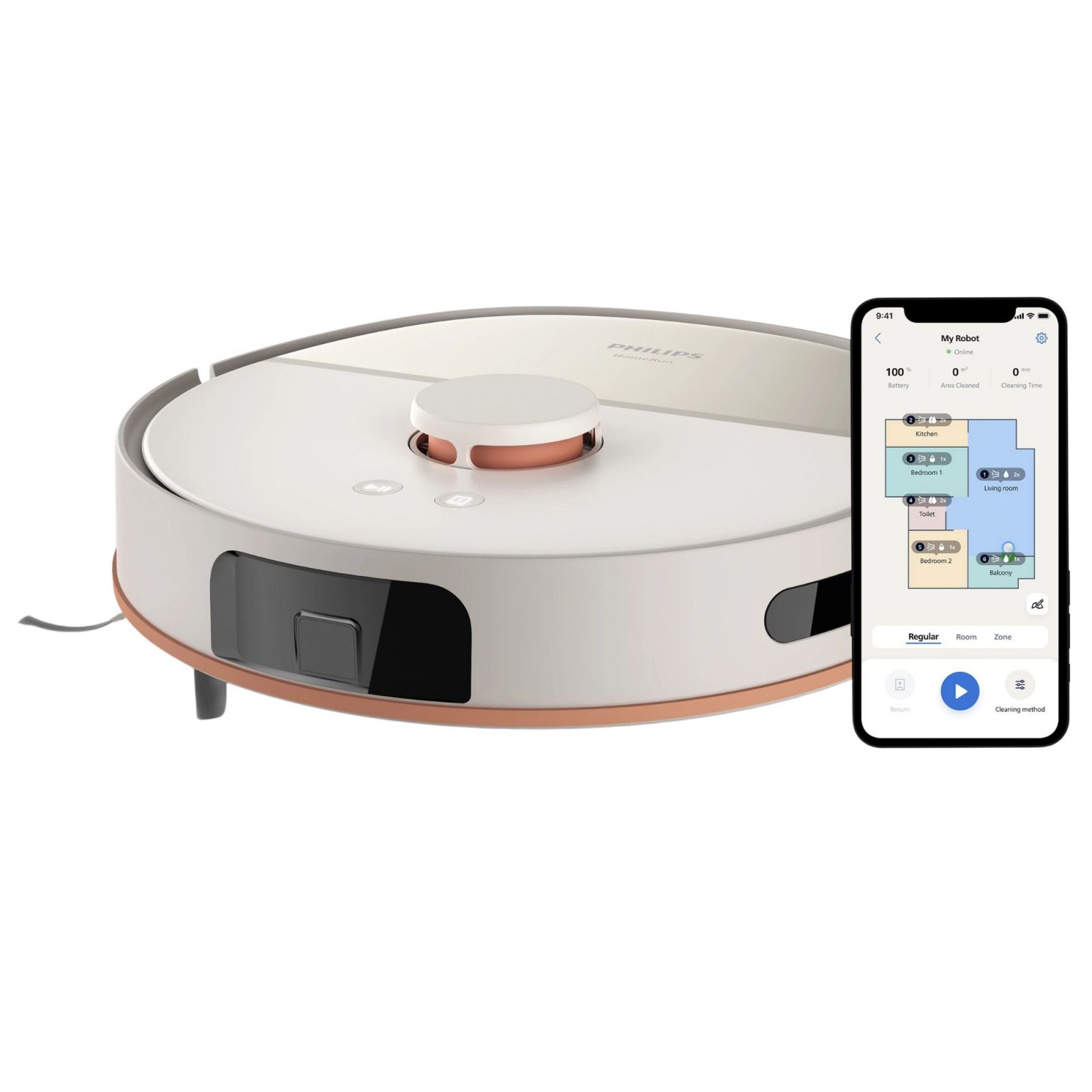 Aplikację robota Philips Aqua opracowano tak, aby była intuicyjna i łatwa w użyciu. Zawiera instrukcje krok po kroku i pomocne filmy, które pozwalają w pełni wykorzystać możliwości urządzenia. Aplikacja komunikuje się z robotem, kontrolując i monitorując jego pracę oraz przesyłając powiadomienia dotyczące sprzątania, gdziekolwiek jesteś, a także na bieżąco pokazując, gdzie jest już posprzątane. Zdecyduj, w jaki sposób chcesz posprzątać każde pomieszczenie, wskaż robotowi, gdzie nie może jechać, lub zaplanuj sesję sprzątania, aby po powrocie do domu zastać nieskazitelnie czystą podłogę.