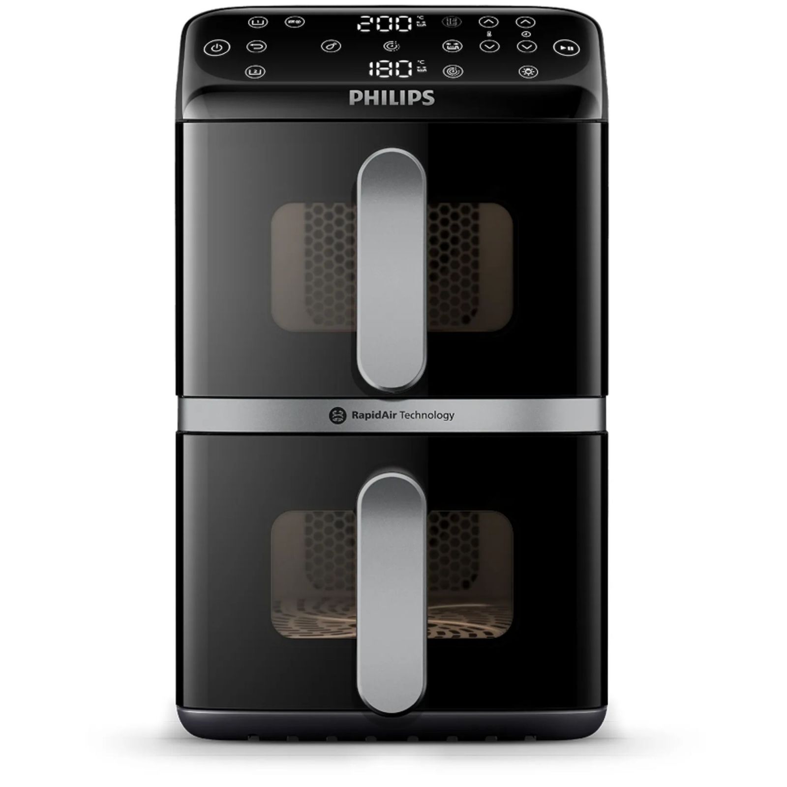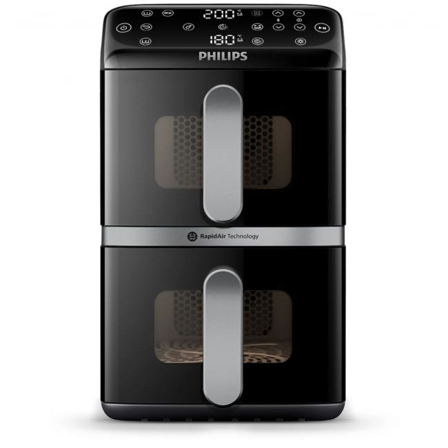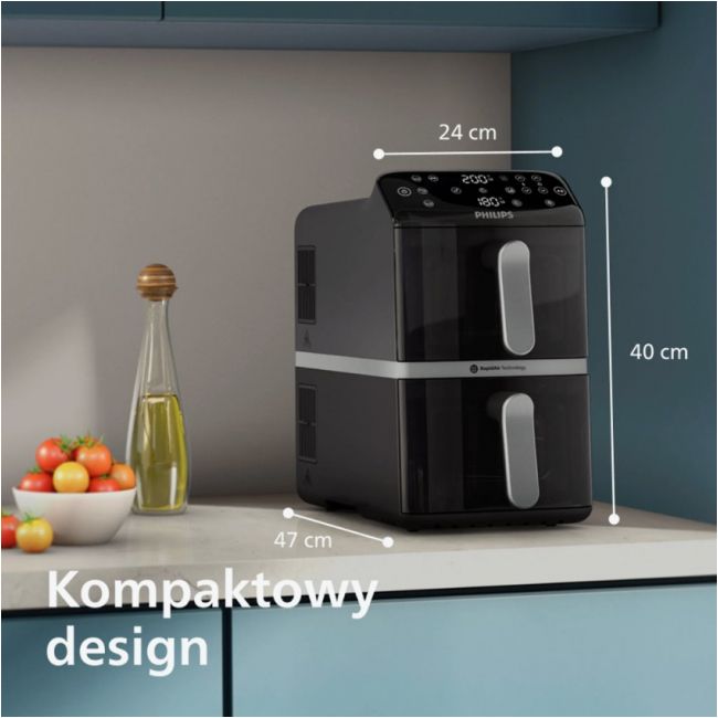 Nasz pionowy Philips Ovi z koszami pozwala na uzupełnienie dwóch posiłków jednocześnie, oszczędzając miejsce. Co więcej, dzięki technologii Vertical RapidAir smak jest zawsze ukryty i delikatny.