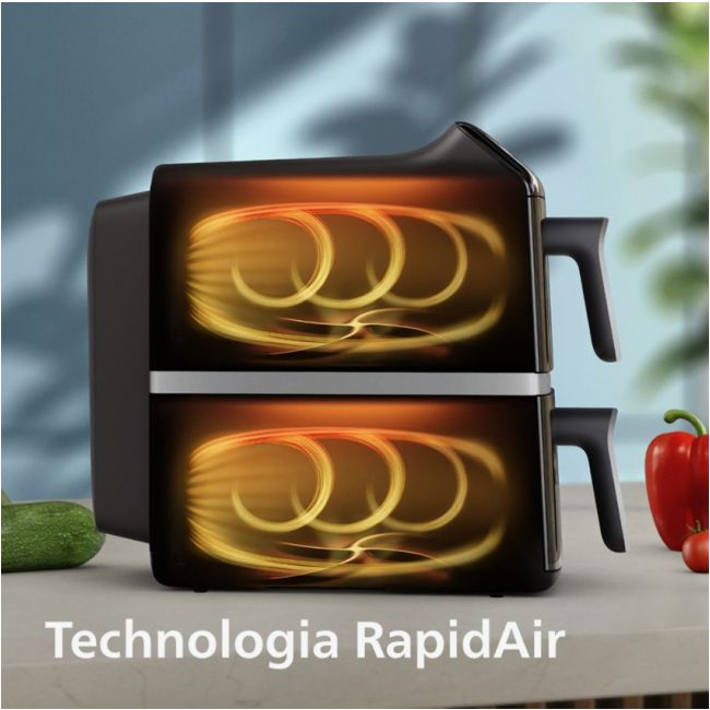 Technologia RapidAir zapewnia idealnie chrupiące i delikatne posiłki. Gorące powietrze krąży wokół jedzenia od góry, co sprawia, że posiłki są równomiernie ugotowane za każdym razem