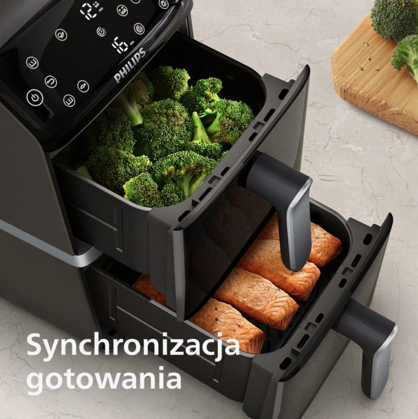 Automatyczna synchronizacja czasu gotowania w 2 koszach, aby posiłki były gotowe w tym samym czasie.