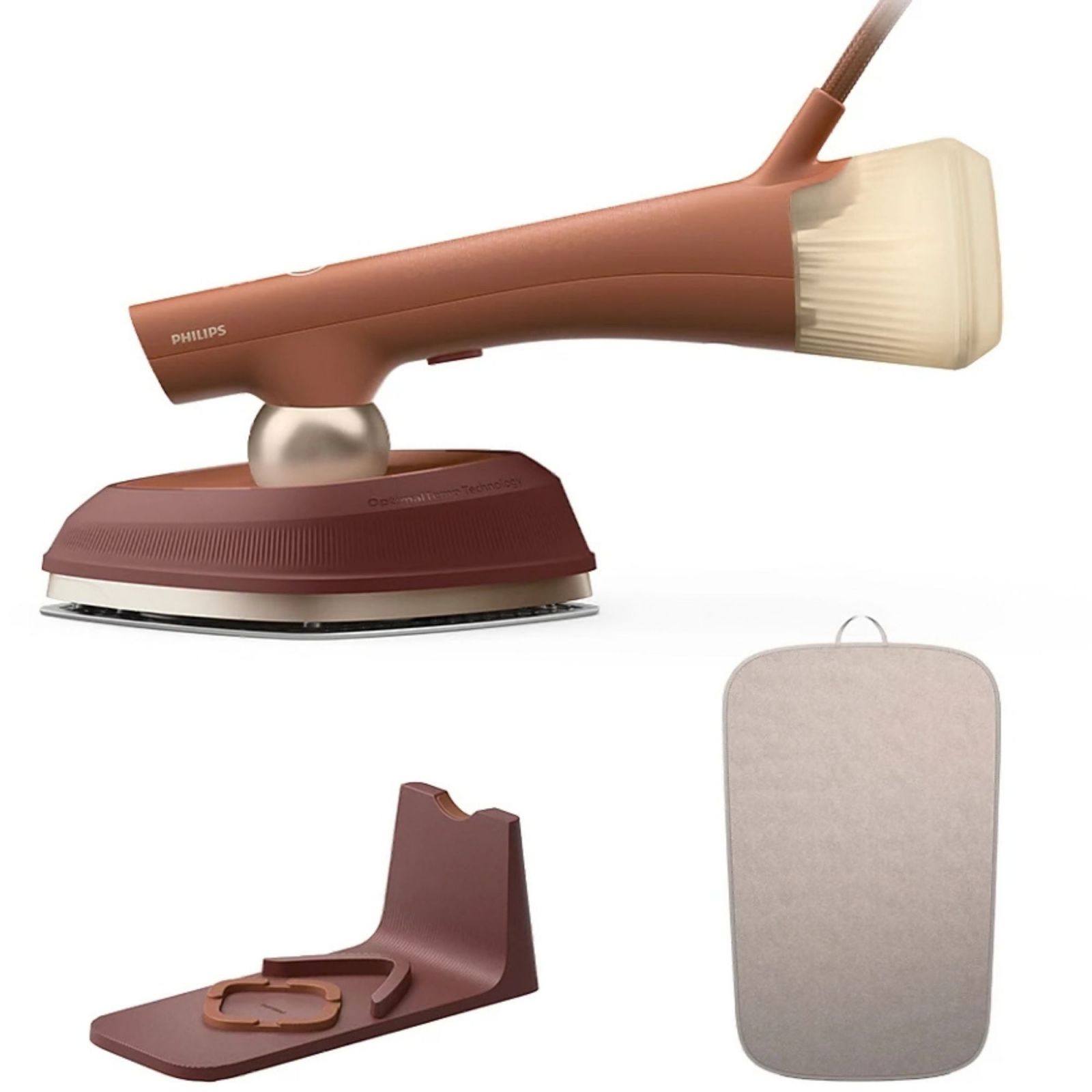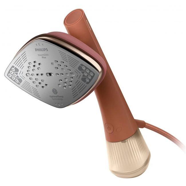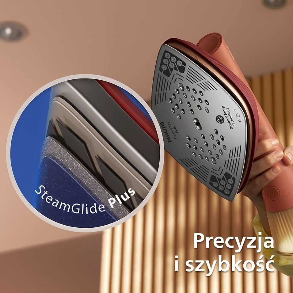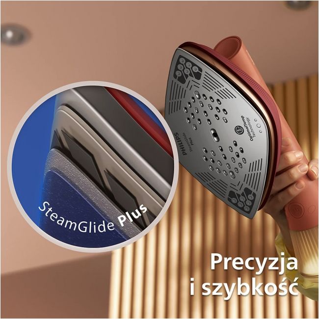 - 2w1: Hybrydowe żelazko i parownica - Obrotowa głowica - Silne uderzenie pary: 90 g/min - Technologia OptimalTemp - Aluminiowa stopa Steam Glide Plus