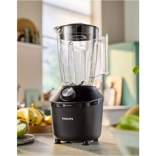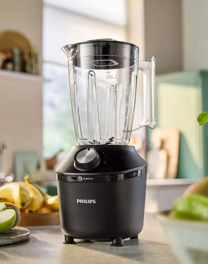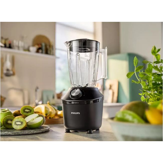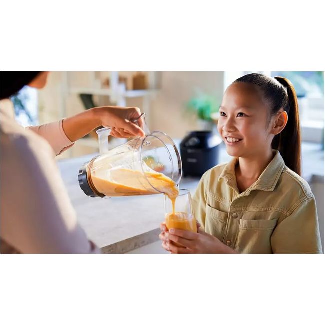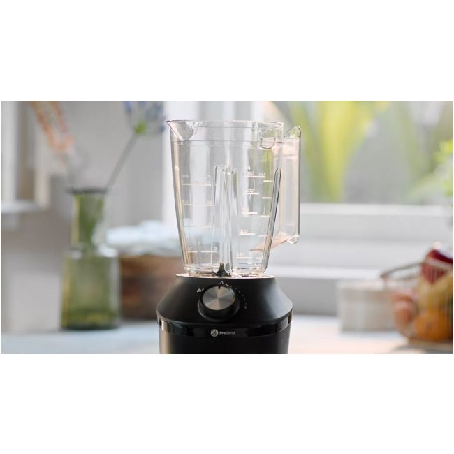 W urządzeniu zastosowano system ProBlend, który łączy 3 technologie dla doskonałych rezultatów. Zapewnia to gładką konsystencję blendowanych produktów, pozbawioną grudek, w jedynie 45 sekund¹. Dzięki mocnemu silnikowi (600 W) składniki cyrkulują równomiernie, a innowacyjny kształt ostrza oznacza większą powierzchnię cięcia. Żebrowanie na dzbanku sprawia, że składniki przesuwają się na tor blendowania.
