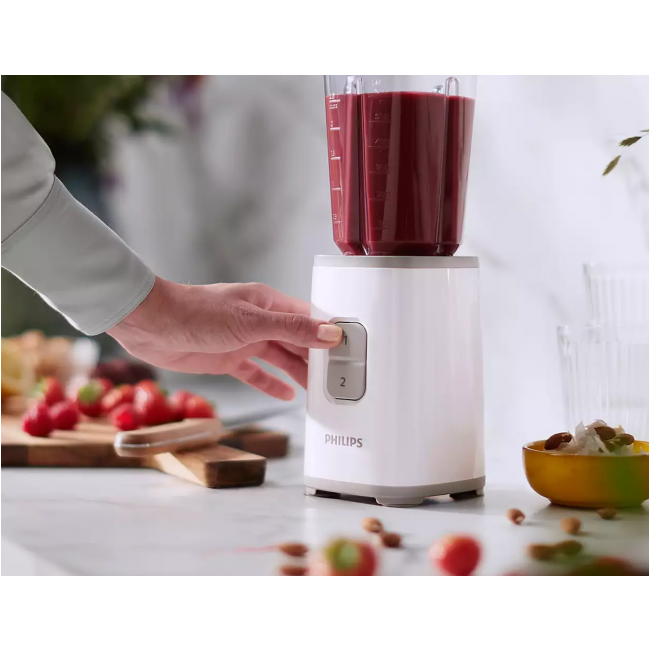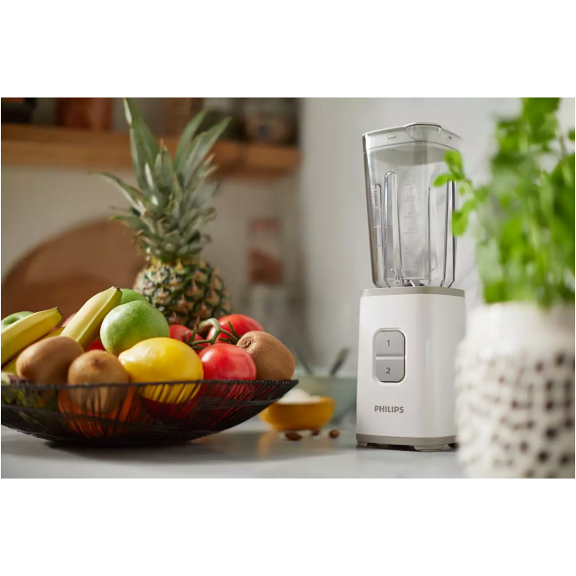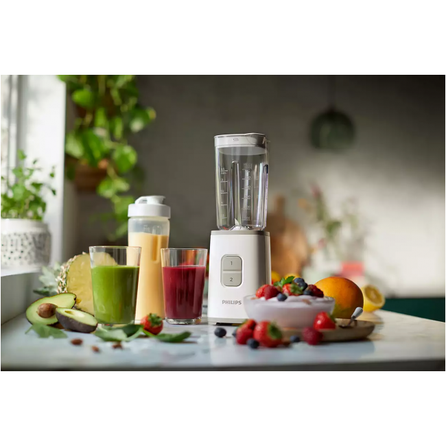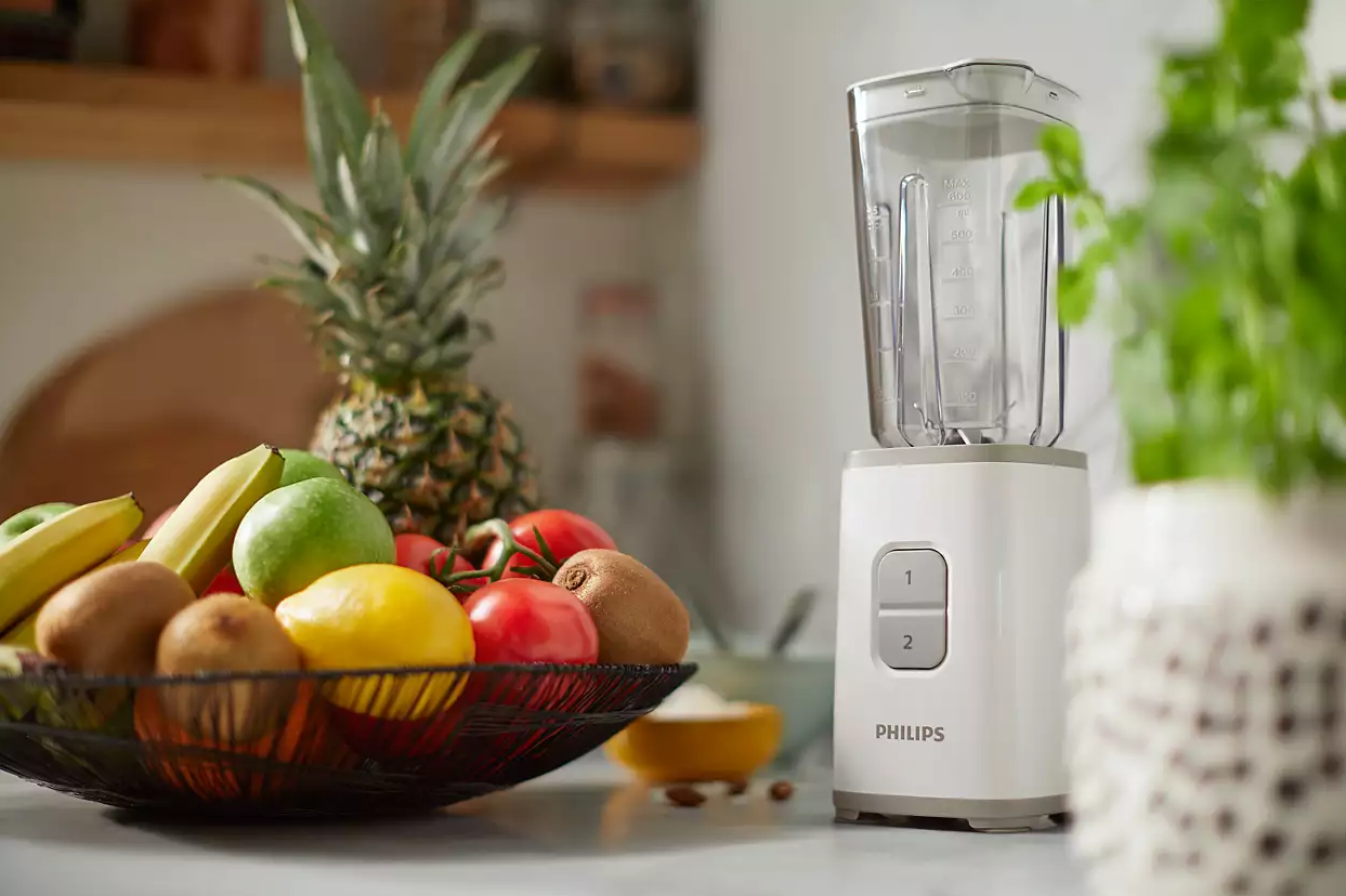 Dzięki kompaktowej, nowoczesnej konstrukcji możesz trzymać miniblender na blacie kuchennym i korzystać z niego, gdy Ci się spieszy.
