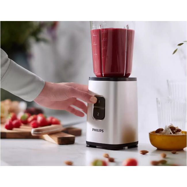 Dzięki kompaktowej, nowoczesnej konstrukcji możesz trzymać miniblender na blacie kuchennym i korzystać z niego, gdy Ci się spieszy.