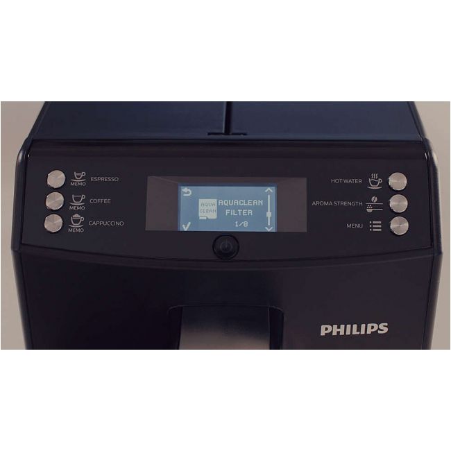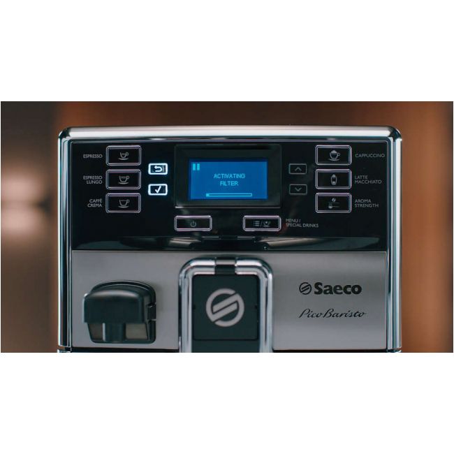 Instalacja filtra jest niezwykle prosta. Wystarczy zamontować filtr AquaClean w zbiorniku wody w pełni automatycznego ekspresu do kawy Saeco, aktywować funkcję za pomocą interfejsu użytkownika i już można delektować się maksymalnie 5000 filiżanek czystej kawy bez potrzeby odkamieniania*.