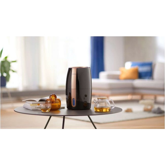 Inteligentny czujnik nieustannie monitoruje wilgotność powietrza i automatycznie utrzymuje jego stałe nawilżanie. Wystarczy wybrać preferowany poziom – 40%, 50% lub 60%. Można wybrać też tryb automatyczny, a nawilżacz sam dopasuje odpowiednie nawilżenie. Za pomocą kolorowego wskaźnika można monitorować czy powietrze w domu osiągnęło już ustawiony przez nas poziom wilgotności.
